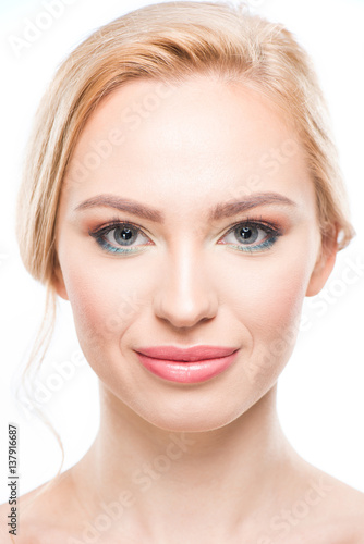 elegance, girl, young, smiling, adult, people, beauty, model, caucasian, vertical, european, pretty, elegant, stylish, woman, make-up, skincare, blond, attractive, gorgeous, sensual, head shot, isolated on white, one person, front view