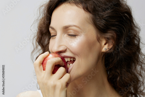 Closeup portrait of happy curly beautiful woman in basic white t-shirt enjoy fresh apple fruit posing isolated on over white background. Natural Eco-friendly products concept. Copy space