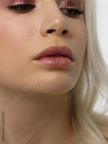 Close-up portrait of the cleanliness face of a beautiful woman with dark black smoky eyes makeup, natural full lips. Sexy model with clean shiny skin, clean face, long curly hair. glamorous image