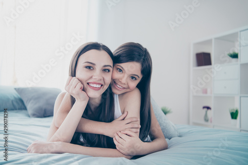 Close-up portrait of two nice adorable careful beautiful attractive lovely charming cute cheerful cheery kind people spending free time having fun cuddling in light white interior room