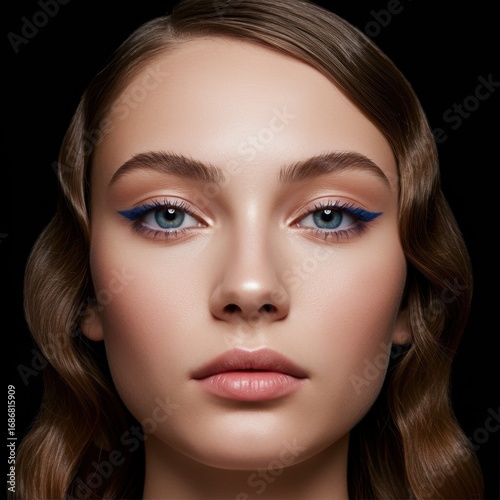Close-up portrait of woman with blue eyeliner and wavy brown hair