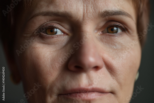 close-up portrait of woman with expressive eyes. natural lighting highlights mature skin texture, capturing emotions and contemplation. ideal for personal and reflective themes in photography