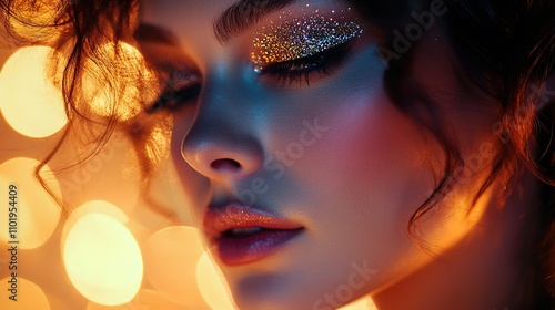 Close-up portrait of woman with glitter makeup and bokeh lights