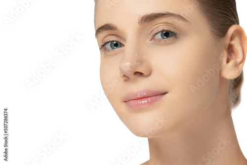 Close-up portrait of young beautiful woman with clean skin looking at camera isolated over white studio background. Cosmetology concept