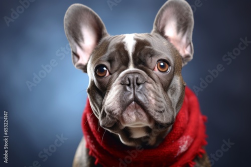 Close-up portrait photography of a cute french bulldog wearing a warm scarf against a metallic silver background. With generative AI technology