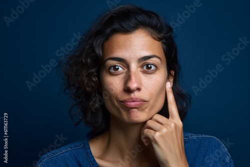 Close-up portrait photography of a happy girl in her 30s making a silence gesture by putting the index finger on the lips against a deep sea-blue background. With generative AI technology