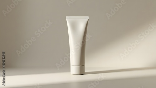 closeup, product shot, cosmetic tube, white, tube mockup, minimalist, studio lighting, glass surface, elegant, high key, product photography