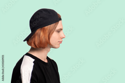 boy, head, 1, person, eye, guy, hair, red, ginger, human, man, male, portrait, young, adult, photogenic, caucasian, profile, down, stare, look, tender, casual attire, wear, black, t-shirt, cap, backward, people, background, green, turquoise, face, copy, space, isolated, model, expression, emotion, adam, apple, larynx, sad, beauty, coiffure, redhead, beautiful, happiness, happy, smile