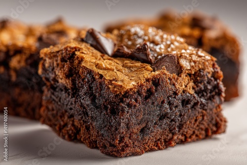 Close-up shot capturing the rich textures and decadent details of chocolate brownies, showcasing a delightful combination of fudgy goodness and indulgent flavors, a perfect treat.
