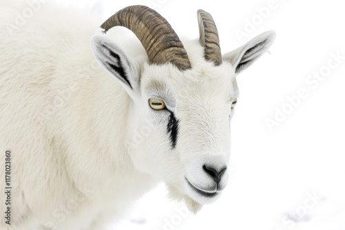 Close-up shot of a goat standing in the snow, surrounded by winter landscape