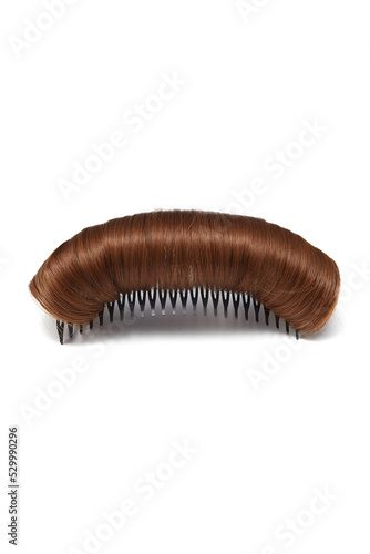 Close-up shot of a hair volumiser. The brown hair pad for hair styling and hair volumizing is isolated on a white background. Front view.