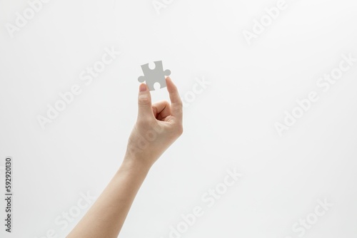 Closeup shot of a hand holding a puzzle piece in front of a white background with copy space