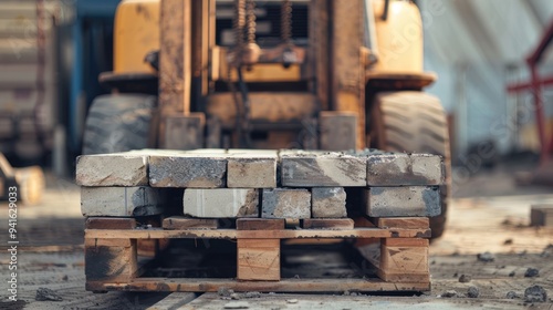 closeup, shot, fork, carrying, pallet, brick, equipment, machinery, construction, site, heavy, operation, handling, industrial, lift, power, control, loader, loading, unloading, safety, hard hat, vest, worksite, load, movement, maintenance, construction equipment, transport