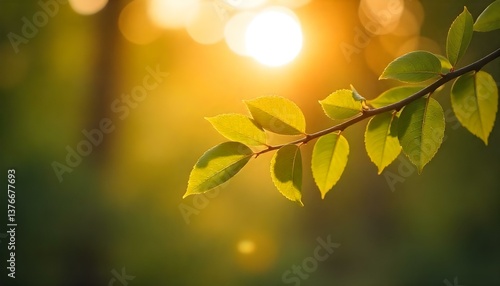 Close-up shot of a tree branch with leaves, bathed in the warm glow of sunlight, bokeh effect, soft diffused lighting, golden hour