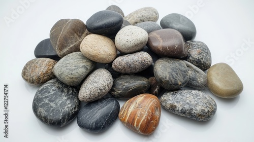 Close-up shot of assorted pebbles stacked in perfect balance, symbolizing harmony and simplicity, displayed on a bright white backdrop