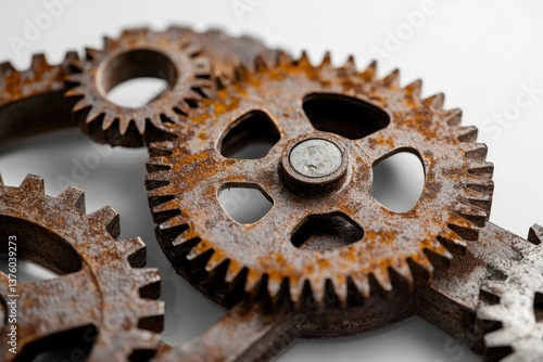 Close-up shot of interconnected, rusty gears showcases the effects of time and wear on mechanical components.