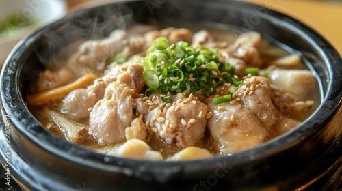Close-up shot of Korean Samgyetang, showcasing tender chicken and ginseng roots in a steaming, flavorful broth. A famous dish for health and energy in Korean cuisine.