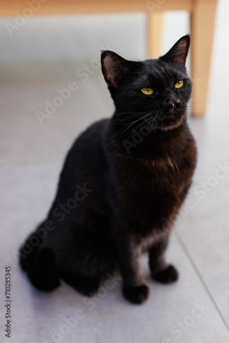 Closeup shot of mature small domestic pure black kitten shorthair pet cat with yellow eyes sitting posing on tile floor looking at camera inside home.