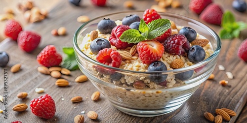 Close-up shot of oatmeal with assorted berries and crushed nuts in a glass bowl , healthy, breakfast, balanced, food