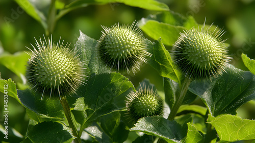 Close-up Study of Burdock Plant Burrs and Foliage in Natural Light