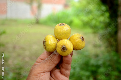 closeup the bunch ripe yellow green tree fruit hold hand over out of focus green brown background.