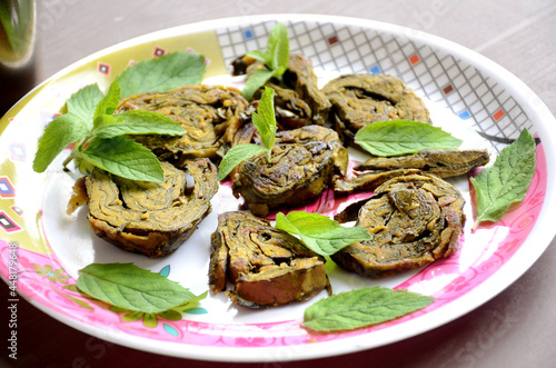 closeup the fried arabic leaves food with green mint in the plate over out of focus brown background.