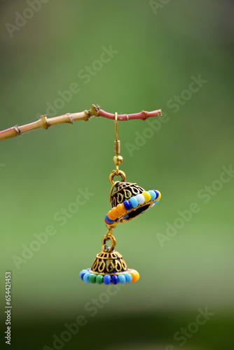 closeup the pair of golden blue color ear ring with beads hold on the plant branch soft focus natural green brown background.