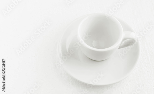 closeup top view on white coffee cup and saucer, empty coffee-free coffee cup, for black coffee, on a white background