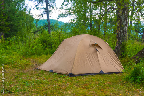tent, racked, camp, equipment, refuge, shelter, tree, tree branch, fir, pine, coniferous, needle, forest, wood, park, grove, timberland, wood, glade, grass, summer, season, landscape, scene, panoramic, nature, environment, travel, hike, expedition, tour tourism, journey, adventure, sport