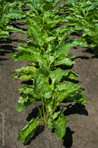 Close-up view from the top on row of green sugar beet leaves at field,