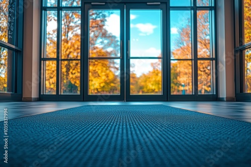 doormat, blue, view, autumn, tree, outside, glasses, door, blurred, fall, foliage, entrance, welcome, interior, exterior, pattern, texture, line, perspective, ground, floor, building, hallway, threshold, carpet, mat, paseo, design, home, office, commercial, residential, modern