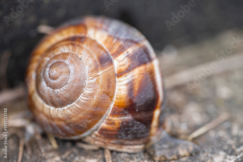 Close-up view of a brown spiral snail in its natural habitat on a moist surface during daylight