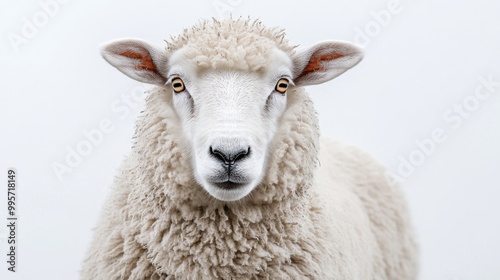 Close-up View of a Fluffy Sheep With a Curious Expression Against a White Background