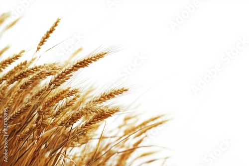 Close-up view of a golden wheat field with mature ears of wheat gently swaying in the wind against a bright, minimalist white background.