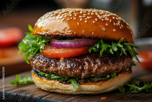 burger, food, hamburger, meat, bun, sesame, tomatoes, lettuce, onion, close, detail, fresh, juicy, delicious, epicure, cooked, wooden, board, plate, topping, tasty, appetising, cookery, meal, ingredient, preparation, eatery, fast, eating, snack, lunch, dinner