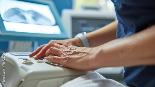 Close-up view of a healthcare professional's hands operating an ultrasound machine