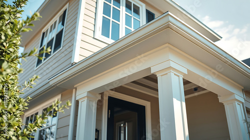 Close-up view of a house's exterior, focusing on a porch with white columns and a beige-toned, wood-siding facade. The image shows large windows and a section of the roofline with gutters.