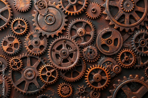 Close-up view of a rusted, vintage gear with intricate clockwork details and metallic surfaces. Industrial steampunk design with fine mechanical patterns