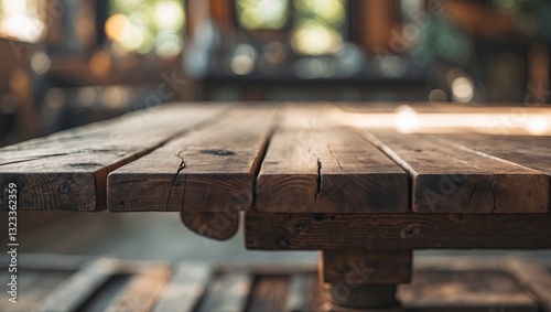 Close-up view of a rustic wooden table in foreground with a softly blurred nature-filled background featuring warm light tones and textures