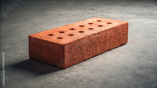 Close-up view of a single red clay brick, highlighting its rough surface and earthy color, set against a textured concrete foreground and a blurred brick wall, perfect for themes of construction