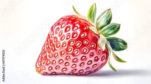 strawberry, red, fruit, fresh, healthy, juicy, bright, vibrant, colours, detail, single, food, nature, image, photo, digital, illustration, graphic, art, painting, texture, realistic, glossy, light, high-coloured, pink, green, leaf, stem, appetising, delicious, studio, lighting, white, background, object, closeup, macro