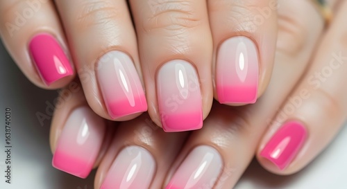 Close-up view of a woman's hands with freshly manicured, vibrant pink and white ombre nails.