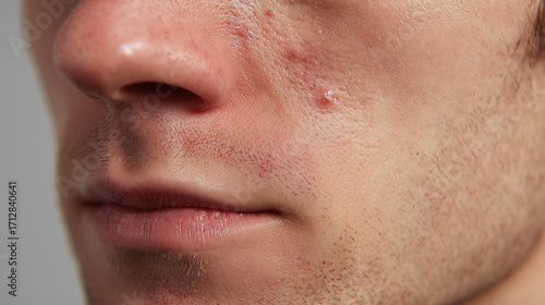 Close-up view of a young man's face showing skin texture with acne and blemishes under natural light conditions Generative AI