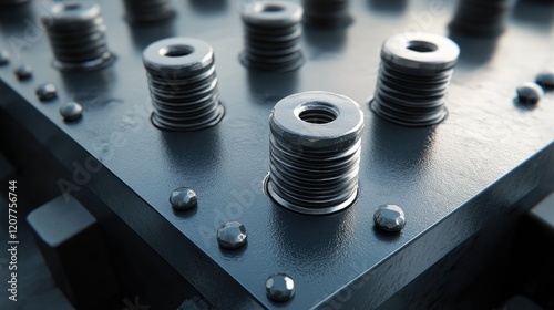 Close-up view of black bolts and nuts secured on a steel plate highlighting industrial design and construction details.