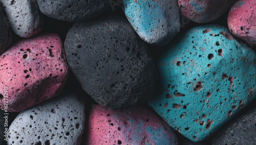 stone, colourful, rock, textured, closeup, painted, natural, abstract, pattern, background, surface, design, decorative, patterned, variety, geometric, shape, volcanic, lava, rough, irregular, pocket, hole, dark, grey, pink, blue, teal, many-coloured, pastel, vibrant, detail, macro, photo, image, composition, texture, material, arrangement, collection, group