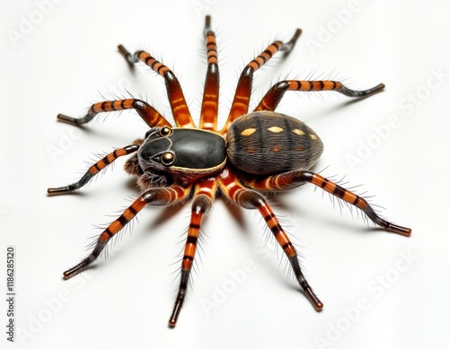 Closeup view of dead spider on white background. Arachnid brown, orange striped legs, dark body with spots. Invertebrate on isolated backdrop. Scary macro view of spider. Dangerous, wild. Pest