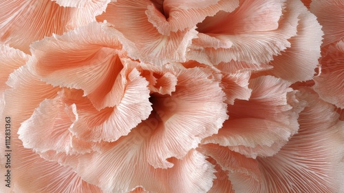 Close-up view of delicate, pale peach-colored oyster mushroom caps, exhibiting intricate, lacy texture.