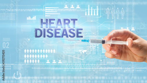 Close-up view of doctor's hand in a white glove holding syringe with HEART DISEASE inscription, healthcare and medical concept