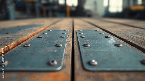 Close-Up View of Industrial Wooden Surface with Metallic Plates and Rivets in a Factory Setting, Highlighting Textures and Details in a Well-Worn Environment