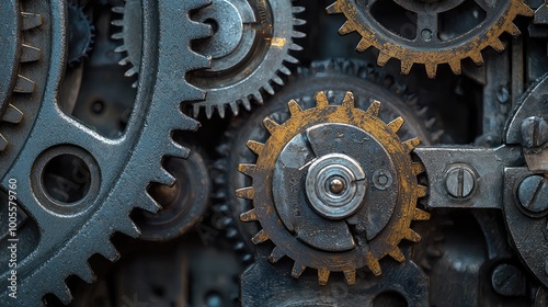 Close-up view of interlocking gears showcasing intricate mechanical design and texture with a touch of vintage rust.